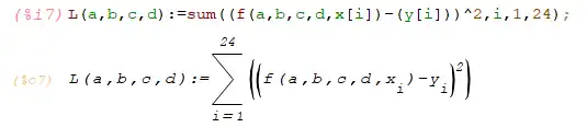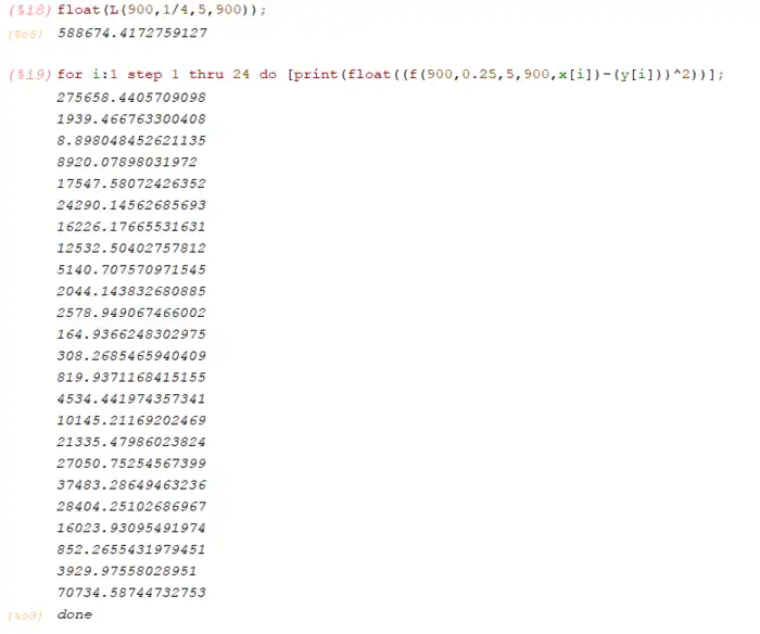 Nun wird die Summe des quadratischen Fehlers berechnet. Dies geschieht durch das Einsetzen der Startwerte in die Fehlerfunktion L. Die Startwerte wurden bereits, durch die Anpassung der einzelnen Parameter mittels Schieberegler, in Modellierungszyklus zwei gewonnen. Neben der Berechnung des gesamten quadratischen Fehlers, wird eine Schleife erstellt, um darüber hinaus die einzelnen Fehler berechnen zu können.