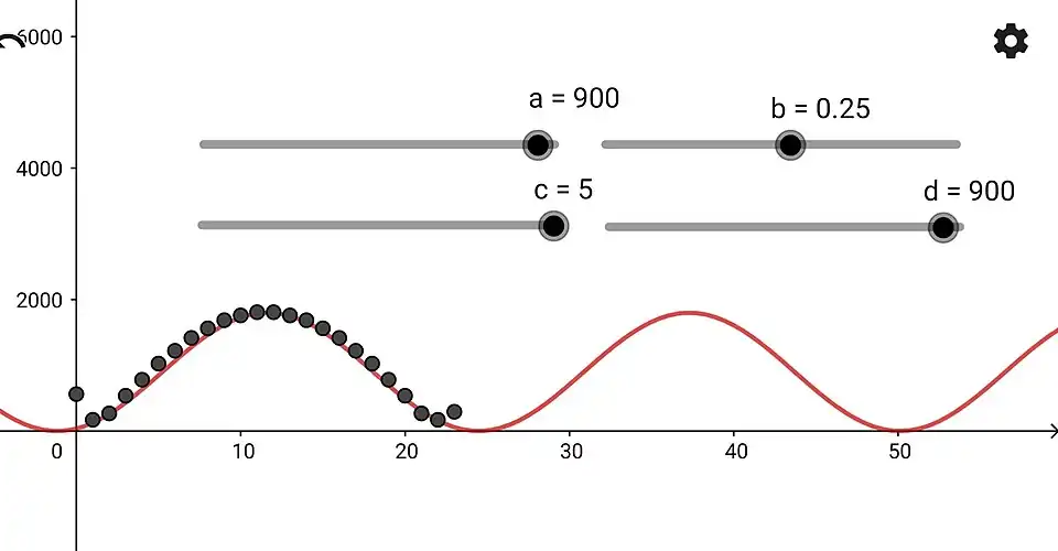 In diesem Zyklus wird die Zukunftsprognose der Stromerzeugung pro Tag modelliert. Aus der Tabelle des ersten Modellierungszyklus werden die Daten "Zeit" und "kWh" in Geogebra übernommen. Diese werden dort in die Tabellenkalkulation eingegeben, sodass die Datenpunkte anschließend im Grafikrechner angezeigt werden können. Die gegebenen diskreten Daten sollen nun durch eine stetige Funktion abgebildet werden, in welcher gleichzeitig eine Zukunftsprognose miteinfließen soll. Deshalb wird hier mit einer allgemeinen Sinusfunktion gearbeitet, die die Datenpunkte approximieren soll, in dem die Parameter a (Amplitude), b (Periode), c (Verschiebung in x-Achse) und d (Verschiebung in y-Achse) mittels Schieberegler an die Datenpunkte angepasst werden.