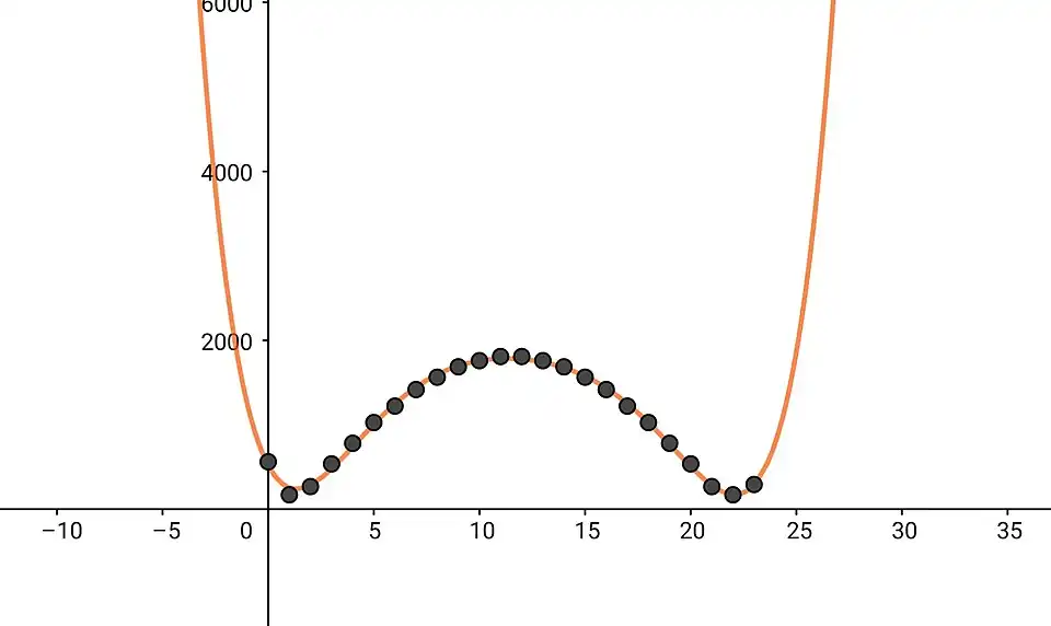 Im ersten Durchgang des zweiten Modellierungszyklus wurden die Datenpunkte, wie oben beschrieben, in die Tabellenkalkulation in Geogebra eingetragen und anschließend im Grafikrechner ausgegeben. Durch den Befehl ‚,Trendpoly‘‘ konnte eine Polynomfunktion erzeugt werden, die die Datenpunkte approximiert. Hierbei konnte festgestellt werden, dass eine Funktion sechsten Grades eine gute Approximation der diskreten Daten ermöglicht. Da die Funktion allerdings nur für x∈[0,23] sinnvolle Funktionswerte angibt und dann für x ⇒ +∞ nach +∞ verläuft, musste man feststellen, dass mit dem weiteren Verlauf der Funktion - nach 24 Stunden - keine Aussage mehr darüber getroffen werden kann, wie die Stromerzeugung an den darauffolgenden Tagen aussieht.