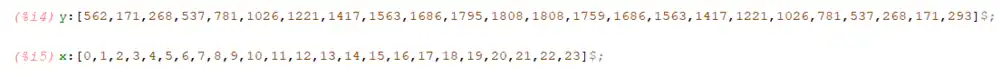 Hierfür wurden in Maxima zwei Vektoren erstellt, welche die zuvor ermittelten x- und y-Werte darstellen (x = Stunde, y = erzeugte kWh).