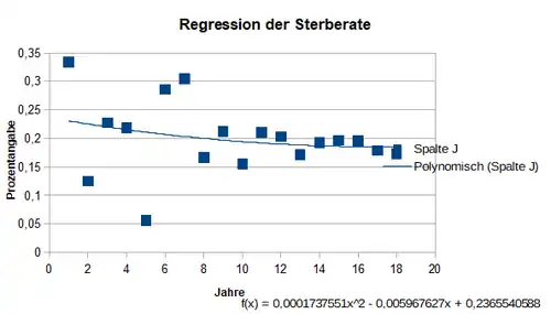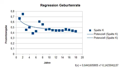 Unsere Werte erhalten wir aus dem vorhergehenden Zyklus. Da die Werte für Geburtenrate und Sterberate nicht als Konstanten angenommen werden können, versuchen wir in diesem Zyklus mittels Regression die jeweilige Gleichung zu bestimmen. Nachdem wir die Daten in einen Graphen eingefügt haben stellen wir fest, dass eine lineare Regression eine ungenaue Gleichung der Werte darstellt. Darum haben wir mittels Calc eine potenzielle Regression der Geburtenrate und eine polynomische Regression der Sterberate durchgeführt.