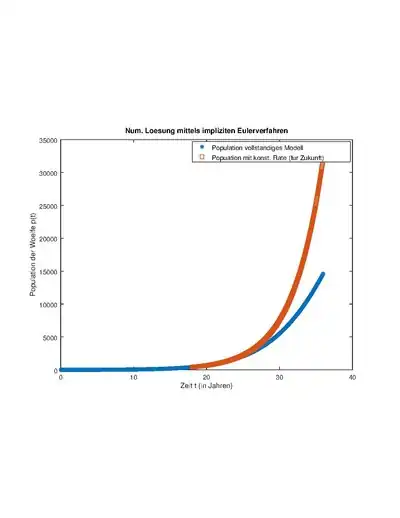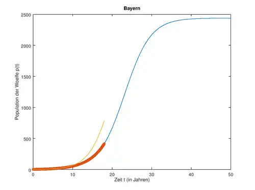 Nachdem wir alles in einer Excel Datei festgehalten haben, haben wir den Mittelwert für a bestimmt. Diesen haben wir dann als festen Wert der Verlustfunktion angenommen und mittels Ocave veranschaulichen lassen. Die ausgegebene Funktion (orange) haben wir mit dem Funktionsgraphen verglichen, die wir mittels des impliziten Euler-Verfahrens (rot) erhalten haben. Da es hier zu enormen Abweichungen kam, haben wir uns die Werte für nochmal genauer angesehen und festgestellt, dass die Zahlen sich langsam einem bestimmten Wert annähern. Daher haben wir den Wert von 2017/18 genommen und ihn als konstantes in Octave festgelegt. Der nun entstandene Graph (blau) veranschaulicht die Wolfspopulation bedeutend besser als der Funktionsgraph mit dem Mittelwert für , da die Abweichung deutlich geringer ist. Nun haben wir den Funktionsgraph weiter in die Zukunft dargestellt bis zum Jahr 2068 (50 Jahre in die Zukunft). Anhand dieser Darstellung können Aussagen über die Zukunft der Wölfe in Bayern getroffen werden, bzw. es kann abgelesen werden, wann die Population gesättigt ist und sich ein "Gleichgewicht" einpendelt.