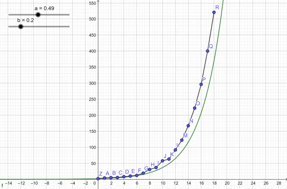 Zuerst müssen wir nun die jährliche Sterberate der Wölfe berechnen. Hierzu verwenden wir die Formel: wobei Totfunde pro Jahr der Spalte I entspricht und Anzahl der Wölfe pro Jahr der Spalte B. Aus den jährlichen Sterberaten ergibt sich eine durchschnittliche Sterberate von 20,02%. Als nächstes müssen wir die Geburtenrate ermitteln. Diese ergibt sich aus: also aus den Spalten E und B. Aus der jährlichen Geburtenrate ergibt sich eine durchschnittliche Geburtenrate von 49,04%. Nun veranschaulichen wir die Wachstumsrate mit Hilfe von GeoGebra, indem wir zuerst die realistischen Wolfszahlen pro Jahr in ein Koordinatensystem eintragen und die Punkte miteinander verbinden. Nun erstellen wir die Wachstumsfunktion: . Wobei y für die Geburtenrate und d für die Sterberate steht. Als setzen wir 2 ein, da es 1999/2000 mit 2 Wölfen in Deutschland begonnen hat. Nun können wir die Funktion, die durch das Malthus Wachstumsmodell entstanden ist mit unseren Wolfszahlen vergleichen.