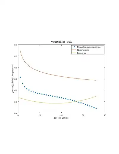 Diese Raten haben wir mittels Octave für die Jahre 2000-2036 graphisch dargestellt. Durch den Verlauf der Raten in der Zukunft konnten wir feststellen, dass unsere Funktionen fehlerbehaftet sind, da die Sterberate polynomisch dargestellt ist. Genauer bedeutet dies, dass die Geburtenrate sinkt und die Sterberate steigt, was die Wachstumsrate schnell sinken lässt. Da dies eine nicht realistische Situation darstellt, haben wir ab dem Jahr 2018 die Werte in der Zukunft mit den konstanten Werten von und berechnet.