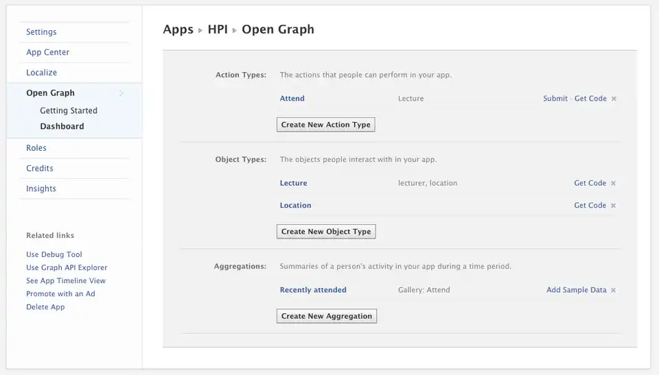 | App Dashboard | Zur Verwaltung der Open Graph Apps |