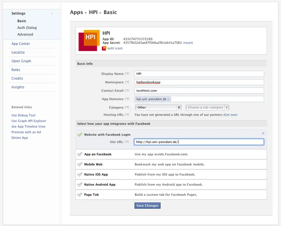 Anlegen einer Facebook App