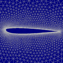 Betrachten Sie die obige Triangulierung der Ebene für die Tragfläche. Was können Sie bzgl. des Flächeninhaltes der Dreicke beobachten? Erläutern Sie, warum die Triangulierung in bestimmten Regionen der Diskretisierung feiner ist.