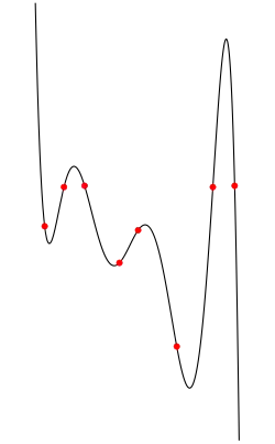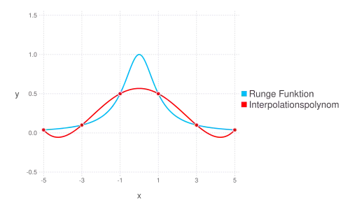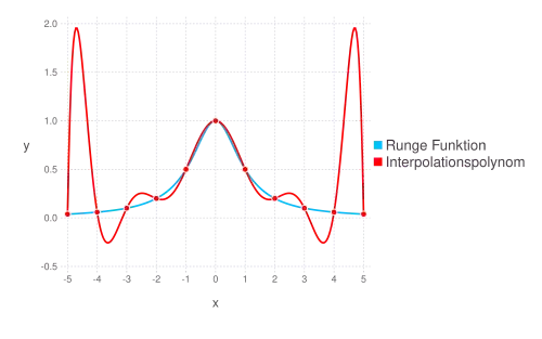 Verbessert sich die Interpolationsgüte, wenn mehr Stützpunkte hinzugefügt werden? Im Allgemeinen nicht: Bei äquidistanten Stützstellen und hohem Grad des Polynoms kann es vorkommen, dass die Polynomfunktion kaum noch der zu interpolierenden Funktion ähnelt, was auch als Runges Phänomen bekannt ist. Polynome streben im Grenzfall gegen . Verhält sich die zu interpolierende Funktion anders, etwa periodisch oder asymptotisch konstant, treten starke Oszillationen in der Nähe der Intervallgrenzen auf. Für solche Funktionen sind Polynominterpolationen über das gesamte Intervall relativ ungeeignet.