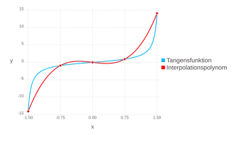 Tangensfunktion (blau) und ihre Polynominterpolante dritten Grades (rot)