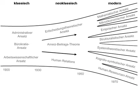 - 1930: Steigende Komplexität im Unternehmen und im öffentlichen Dienst bewirkte, dass der Mensch zunehmend mit dem Lösen von Problemen konfrontiert war. Dies setzte ein steigendes Bildungsniveau voraus und führte außerdem zu steigendem Motivationsniveau. Der Mensch wurde zum Bedürfnisträger. (humantheoretischer Ansatz)