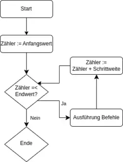 Bei einer For-Schleife werden Befehle so oft wiederholt, bis der Befehl für alle Elemente der Zählvariable durchgeführt wurde. Nach "for" folgt der Name der Variable, für welche mit ":" ein Anfangswert festgelegt wird. Dann steht hinter dem angeschlossenen "step" die Schrittweite gefolgt vom "thru" und dem Endwert. Abschließend folgt ein "do" mit der Befehlsequenz, d.h. die durchzuführenden Befehle werden durch "," getrennt aneinander gereiht. Als Minimalbeispiel soll die for-Schleife dienen, welche die Zahlen 1 bis 10 ausgibt:
