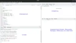 Die Abbildung zeigt die graphische Oberfläche von RStudio. In der Console können Befehle direkt ausgeführt und darunter die Ausgabe dargestellt werden. In dem Fenster darüber, in der Abbildung als Arbeitsbereich bezeichnet, können Skripte geschrieben werden. Mit den Felder "Run" bzw. "Source" werden einzelne Zeilen bzw. das ganze Skript ausgeführt. Dies Ausgaben erscheinen dann ebenfalls in der Console. Rechts in der Umgebung werden die eingegebenen Objekte wie Vektoren, Matrizen etc. aufgelistet mit ihren Eigenschaften.