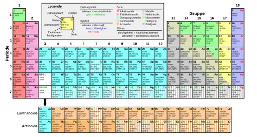 Wie schon gesagt, sind im Periodensystem der Elemente alle bekannten "Grundbausteine" für die Stoffe, der verschiedenen Elemente, nach einer bestimmten Systematik angeordnet. Die Elektronen, also die negativ (-) geladenen Teilchen, die sich fortwährend um den Kern herum bewegen, ordnen sich immer in "Schichten" zu acht um den Atomkern. Im PSE gibt es zunächst einmal eine horizontale Aufteilung in Perioden. Von links nach rechts gelesen nimmt die Anzahl der Elektronen der äußeren Hülle zu, die Anzahl der Schalen/Hüllen steigt von oben nach unten. In der ersten Periode (in der sich ausschließlich Wasserstoff (H) und Helium (He) befinden) ist die sogenannte Edelgaskonfiguration bereits nach 2 Elektronen (Die Abkürzung für Elektron ist "") gefüllt. Somit besteht die erste Elektronenschale aller Elemente aus zwei anstatt acht Elektronen. ((todo: wofür stehen die Zahlen?)) Weiterhin findet eine Aufteilung in Hauptgruppen und Nebengruppen statt.