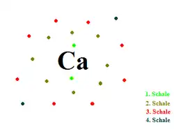 Nimmt man also beispielsweise das Element Calcium (2. HG, 4. Periode), so stellt man fest, dass Calcium 2 Elektronen auf der äußersten Schale besitzt, wobei die äußere Schale die 4. Hülle bildet.