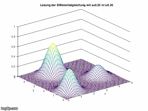 fig_index=floor([0.05:0.05:1]*Nr_timesteps) j=0 for i=fig_index sol_matrix=reshape(matrix_solution(:,i),N,M);%Matrix mit N(Zeilen) x M(Spalten) sol_matrix=sol_matrix'; disp(['Figure ',num2str(round(i/fig_index(1)))]); j=j+1; figure(j); surface(x,y,sol_matrix*hx^2, "EdgeColor", "none") %multipliziert mit hx^2, damit Anzahl der Infizierten pro Raster und nicht Dichte dargestellt wird colormap ("jet") axis([0 xend 0 yend 0 1.1*max(max(B))*hx^2]) colorbar title (["Loesung in t=", num2str(round(delta_t*i))]); ylabel("y") xlabel("x") test=["Fig_", num2str(j),".jpg"] endfor