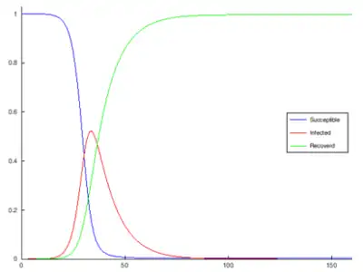 for hold on plot (i, Si, 'b') plot (i, Ii, 'r') plot (i, Ri, 'g') legend ("Succeptible","Infected","Recoverd" ) hold off endfor