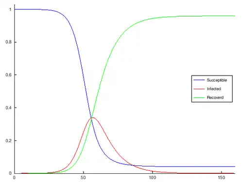 Im zweiten Versuch soll der Verlauf der Infizierungen mehr einer Glockenkurve gleichen. Deshalb wird das Modell verbessert, indem wir anstelle einer Transportmatrix Funktionen für S, I und R erstellen, die den Verlauf der Pandemie möglichst gut abbilden.