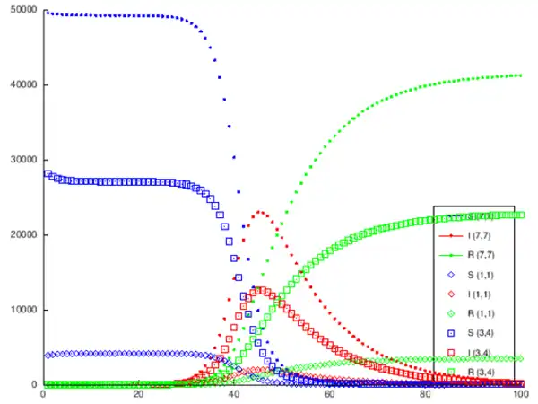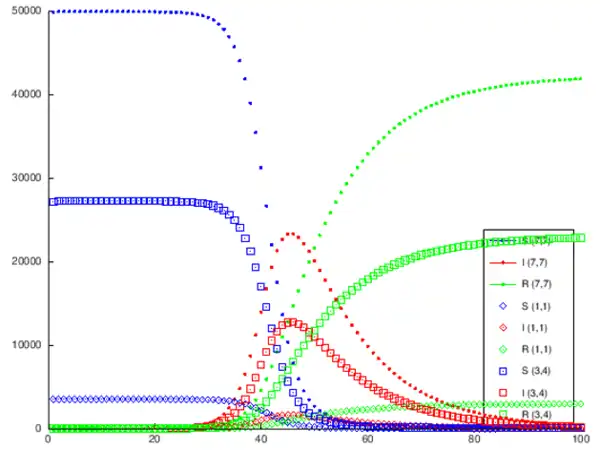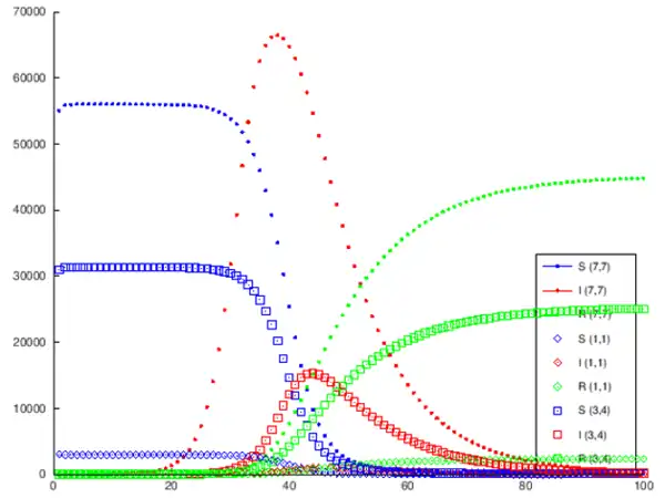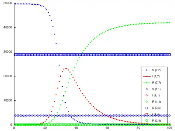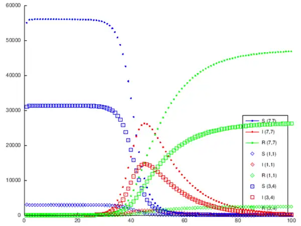 legend ("S (7,7) ","I (7,7) ","R (7,7) ","S (1,1) ","I (1,1) ","R (1,1) ","S (3,4) ","I (3,4) ","R (3,4) ","location","southeast" )