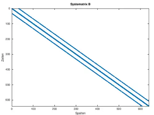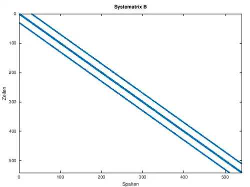 Vec1=ones(N*M,1); %erzeugt Vektor der Länge N*M BB=diag(-4.*Vec1,0)+diag(ones(N*M-1,1),1)+ diag(ones(N*M-1,1),-1)+diag(ones(N*(M-1),1),N)+diag(ones(N*(M-1),1),-N); %Systemmatrix N^2xN^2 mit -4 auf der Diagonale und 1 auf den Nebendiagonalen und 1 auf der N-ten und -N-ten Nebendiagonale