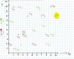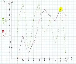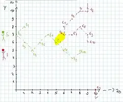 Unsere Ausgangsidee: In einem 10x10 Gebiet bewegen sich drei Personen. Dabei wird die x-Koordinate als zeitlicher Verlauf angesehen und nur mit der y-Koordinate wird die räumliche Ausbreitung bestimmt. Daher wird die Ausgangsidee für eine räumliche Ausbreitung sowohl in x- als auch in y-Richtung im 1. Zyklus überarbeitet.