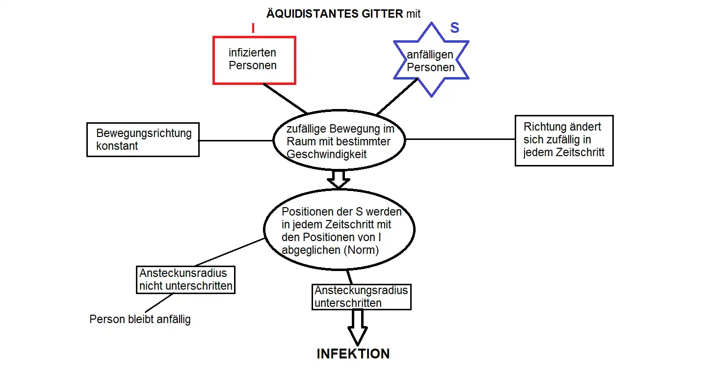 Zunächst wird der Abstand zwischen den Infizierten und anfälligen Personen berechnet. Im nächsten Schritt wird die Ansteckung beschrieben, bei der eine infizierte Person eine anfällige Person ansteckt