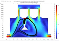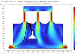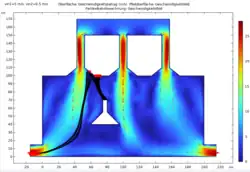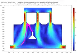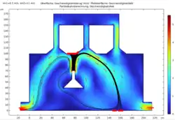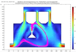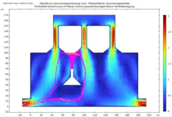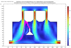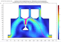 | Durchlauf 1 | Einlassgeschwindigkeit der Luft vin1= 0.5 m/s Einstromgeschwindigkeit des Gases vin2= 2 m/s | Bei konstanter Einlassgeschwindigkeit der Luft und einer 4-fach höheren Einstromgeschwindigkeit des Gases ist eine ähnliche Geschwindigkeit, wie in M1 in den Röhren zu beobachten. Auch die Teilchenbahnen ähneln den masselosen Teilchen, wobei nun einige der Teilchen auf der Strecke hin zum Ausstrom stagnieren und mit einer geringeren Geschwindigkeit als in M1 ausströmen. | ![]() |