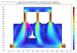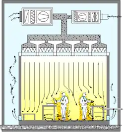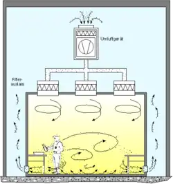 - Bei der turbulenten Verdünnungs- oder Mischströmung wird die gefilterte Reinluft turbulent (verwirbelnd) in den Reinraum eingeführt und erzeugt eine stetige Verdünnung der Partikelkonzentration. Die geforderte Reinraumklasse wird dann bei reinraumgerechtem Verhalten des Personals aufrechterhalten. Hier ist besonders darauf zu achten, dass Partikel erzeugende Objekte und Vorgänge im Reinraum minimiert werden.