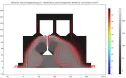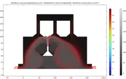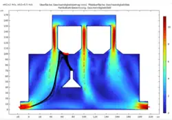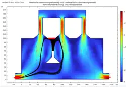 | Durchlauf 2 | Im Vergleich zum ersten Bild wurde die Randbedingung geändert, sodass nun der Einstrom in die Richtung der Normalen erfolgt und somit die Konzentration zu Beginn stärker ist und erst danach wie in Durchlauf 1 den Stromlienien folgt. | ![]() |