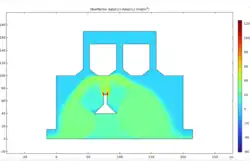 | Durchlauf 3 | Einlassgeschwindigkeit der Luft vin1= 0.5 m/s Einstromgeschwindigkeit des Gases vin2= 11 m/s | Bei konstanter Einlassgeschwindigkeit der Luft und einer höheren Einstromgeschwindigkeit des Gases wird der Strom in den Röhren nurnoch auf etwa 2,5 [m/s] beschleunigt. Bei einer 4-fach höheren Einstromgeschwindigkeit des Gases, ist der Ausfluss der Teilchen deutlich geringer und es haften nicht nur Teilchen am oberen Rand an, sondern auch an den unteren Rändern. | ![]() |