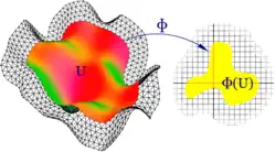 Die Abbildungen nennt man die Karten der Mannigfaltigkeit und heißt auch das Kartengebiet und das Kartenbild. Die passende Vorstellung ist, dass die Mannigfaltigkeit die (komplizierte, gekrümmte) „Wirklichkeit“ ist, die man ausschnittsweise mit der Hilfe von flachen Karten erfassen kann. Einen Homöomorphismus