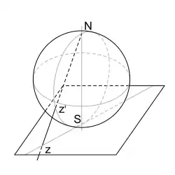 die komplex differenzierbar ist und reell durch gegeben ist (bei den in Beispiel 75.1 (Analysis (Osnabrück 2014-2016)) beschriebenen Projektionen muss man einmal komplex konjugieren, damit alles passt). Dadurch ist auf der Kugeloberfläche die Struktur einer eindimensionalen komplexen Mannigfaltigkeit gegeben. Diese heißt die komplex-projektive Gerade oder auch die riemannsche Zahlenkugel. Die Überdeckung mit den beiden zu biholomorphen offenen Mengen nennt man auch die affine Standardüberdeckung, siehe auch Satz 5.6. Wenn man eine dieser offenen Mengen fixiert hat, so nennt man den einzigen fehlenden Punkt auch den unendlich fernen Punkt. In der anderen offenen Menge ist dieser der Nullpunkt.