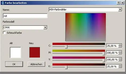- Wir verwenden das bereits selektierte CMYK-Farbmodell und definieren zunächst die Farbe "rot" nach wikimedia:Wikimedia visual identity guidelines#Color specifications. Setze