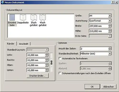 - Starte Scribus oder wähle Datei → Neu. Es erscheint der Dialog rechts: