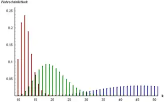 Es wird nun so lange eine Kugel gezogen und wieder zurückgelegt, bis erstmals genau Kugeln erster Sorte resultieren. Man kann eine Zufallsvariable : „Zahl der Versuche, bis erstmals Erfolge resultieren“ definieren. Die Zahl der Versuche liegt in der Menge . hat abzählbar unendlich viele mögliche Ausprägungen.