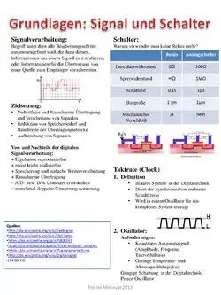 In meinem Plakat kann man etwas über die Grundlagen eines Analogschalters im Vergleich zu einem manuellen Schalter (hier: Relais) lesen und verstehen, warum heute keine Relais mehr in Computern verwendet werden. Dies mach ich, indem ich die Eigenschaften von den beiden Schaltern in den direkten Vergleich stelle. Zusätzlich erfährt man ein wenig über die Grundlagen der Signalverarbeitung und die der Taktrate bzw des Oszillators.