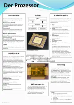 Der Prozessor ist das Herzstück des Computers. Das Referat gibt eine Übersicht über die Komponenten und die Funktionsweise eines Prozessors. Moderne Prozessoren sind nach der Von_Neumann-Architektur aufgebaut. Sie bestehen aus einem Steuerwerk, einem Rechenwerk, Registern, Bussen und Caches. Programme werden nach dem Von-Neumann-Zyklus abgearbeitet: Zuerst wird ein Befehl ins Befehlsregister geladen(Fetch) und vom Steuerwerk dekodiert(Decode). Dann werden die benötigten Werte in die Register geladen(Fetch Operands) und die Operation im Rechenwerk ausgeführt. Zum Schluss werden die berechneten Werte in ein Register geschrieben(Write Back). Alle Befehle, die ein Prozessor ausführen kann, bilden den Befehlssatz. man unterscheidet zwischen zwei Befehlssatztypen: CISC(Complex Instruction Set Computing) und RISC (Reduced Instruction Set Computing). Ein CISC-Befehlssatz setzt möglichst viele(und komplexe) Befehle auf Prozessorebene um, während ein RISC-Befehlssatz nur wenige Befehle bereitstellt und die Software komplexere Befehle selber implementieren muss. Die Leistungsfähigkiet(Schnelligkeit) eines Prozessors misst man an seiner Taktrate und seiner Wortbreite. Die Taktrate gibt an wie schnell Befehle abgearbeitet werden können und die Wortbreite gibt die maximale Größe von Daten an, die ein Prozessor verarbeiten kann. Sie bestimmt wichtige Größen auch wichtige andere Größen wie die maximale Größe des Arbeitsspeichers.