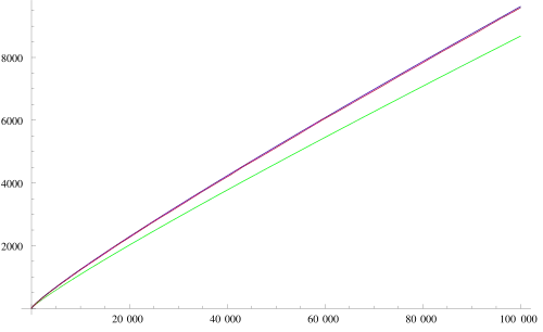 Den Primzahlsatz kann man auch so verstehen, dass die Wahrscheinlichkeit, dass eine Zahl in der Größenordnung eine Primzahl ist, gleich ist. In der Tat ist sogar das Integral dazu, also der sogenannte Integrallogarithmus , eine bessere Approximation für als . Für ist , und (die beiden letzten Werte gerundet).