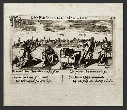 Kupferstich (Plattenrand 10 x 15 cm) mit der Ansicht Leipzigs von Osten um 1620 nach einem Entwurf von Daniel Meißner, gestochen von Eberhard Kieser. Aus: Thesaurus philopoliticus, Frankfurt a. M.: Eberhard Kieser 1623 - 31.
