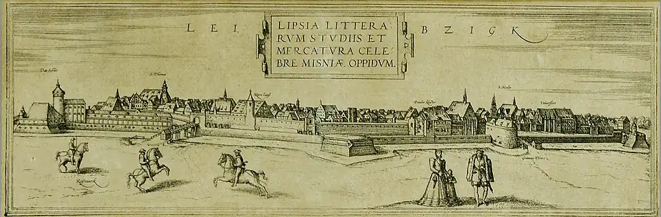 Leibzigk: Lipsia litterarum studiis et mercatura celebre Misniae oppidum. (Die berühmte Meißnische [sächsische] Stadt der Literatur und des Handels Leipzig).