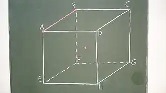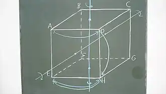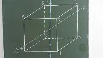 Zu jeder der zwölf Würfelkanten gibt es einen Kantenmittelpunkt. Ein solcher Kantenmittelpunkt definiert mit dem Mittelpunkt der gegenüber liegenden Kante eine Kantenmittelpunktsachse. Betrachten wir beispielsweise die Kantenmittelpunktsachse , die durch die Mittelpunkte der durch