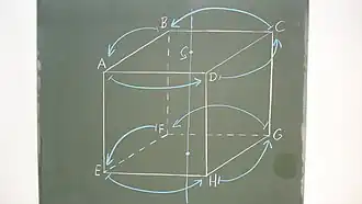 Wie viele eigentliche Würfelsymmetrien gibt es? Um diese Frage beantworten zu können, ist es wieder hilfreich, die Wirkung der Symmetrien auf der Menge der Eckpunkte zu betrachten. Offenbar kann man den Punkt auf jeden anderen Eckpunkt, nennen wir ihn , bewegen. Dazu genügt es beispielsweise, einige Vierteldrehungen um verschiedene Seitenmittelpunktsachsen hintereinander durchzuführen. Es gibt dabei allerdings mehrere Bewegungen, die auf abbilden. Was kann beispielsweise mit unter einer solchen Bewegung geschehen? Da zu benachbart ist, muss auch der Bildpunkt von zum Bildpunkt von , also zu , benachbart sein. Dafür gibt es genau drei Möglichkeiten, da eben genau zu drei Eckpunkten benachbart ist. Durch eine Drehung um die Raumdiagonale durch kann auch jede dieser Möglichkeiten verwirklicht werden. Es gibt also verschiedene Möglichkeiten, für die beiden Eckpunkte