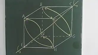- Es gibt acht Eckpunkte und daher vier Raumdiagonalen. Um diese Achsen gibt es jeweils die Dritteldrehung und die Zweidritteldrehung, macht acht Stück.