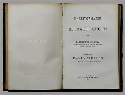 Nietzsche, Friedrich: Unzeitgemässe Betrachtungen. Erstes Stück: David Strauss der Bekenner und der Schriftsteller. Leipzig: Fritzsch. 1873, 101 S., Erstdruck.