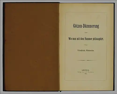 Nietzsche, Friedrich: Götzendämmerung oder Wie man mit dem Hammer philosophiert. Leipzig: C. G. Naumann 1889. 144 S.