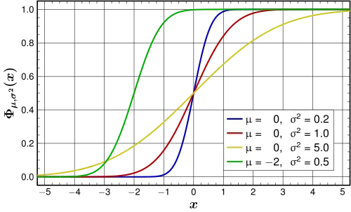 Verteilungsfunktion Verteilungsfunktionen der Normalverteilungen:(blau), (rot), (gelb) und (grün) | |