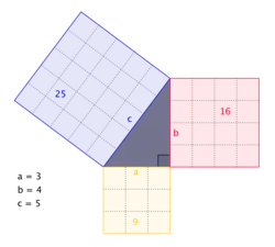 Diese Gleichung 32 + 42 = 52 ist die kleinste Lösung der Pythagorasgleichung a2 + b2 = c2 mit ganzen Zahlen.