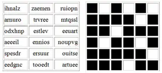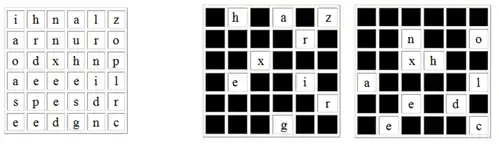 Dabei schrieb Sarcany die gesamte 1. Spalte der geheimen Nachricht gemäÿ der Abbildung unten links auf und legte die Schablone (rechte Abbildung) darüber. Anschlieÿend drehte er bei allen drei Spalten die Schablone jeweils um 90 Grad.