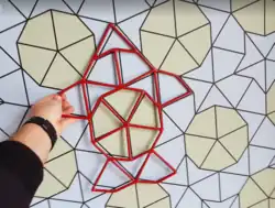 Bei dem vorliegenden Exponat liegt ein aperiodisches Feld vor. Dieses aperiodische Feld beinhaltet ,Drachen' und ,Pfeile'. Ziel ist es, anhand einer vorgegebenen Schablone in diesem Feld den Umriss eines Fisches zu finden.