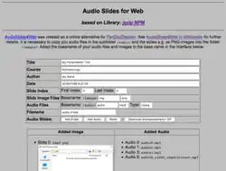 - AudioSlides4Web erstellt eine ZIP-Datei mit Ordnern für Bilder und Audio-Kommentare, die für jede Folie aufgenommen werden, z.B. für Wiki2Reveal. Eine generierte HTML-Datei bettet Folien und Audio-Player für die Folien ein. Die Folien können für Offline-Präsentationen in einem Web-Browser oder online für den asynchronen Zugriff auf Web-Präsentationen mit Audio-Kommentaren verwendet werden.