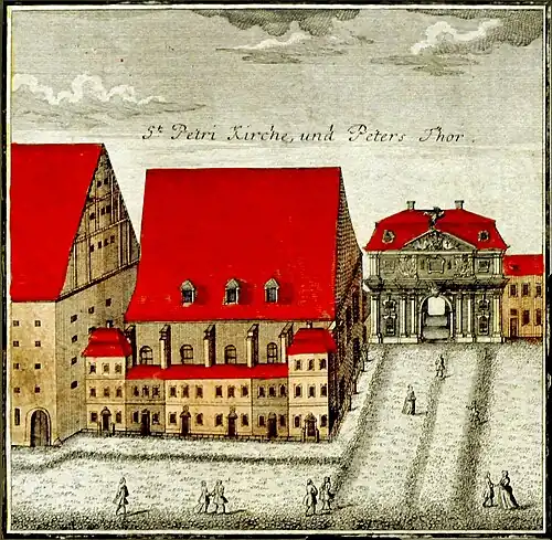 St. Petri Kirche und Petersthor [Leipzig 1749]. Kupferstich, alt koloriert. Ausschnitt aus einem großformatigen Blatt von Joachim Ernst Scheffler, Architekt in Leipzig, † 1751. Hier mit höherer Auflösung.